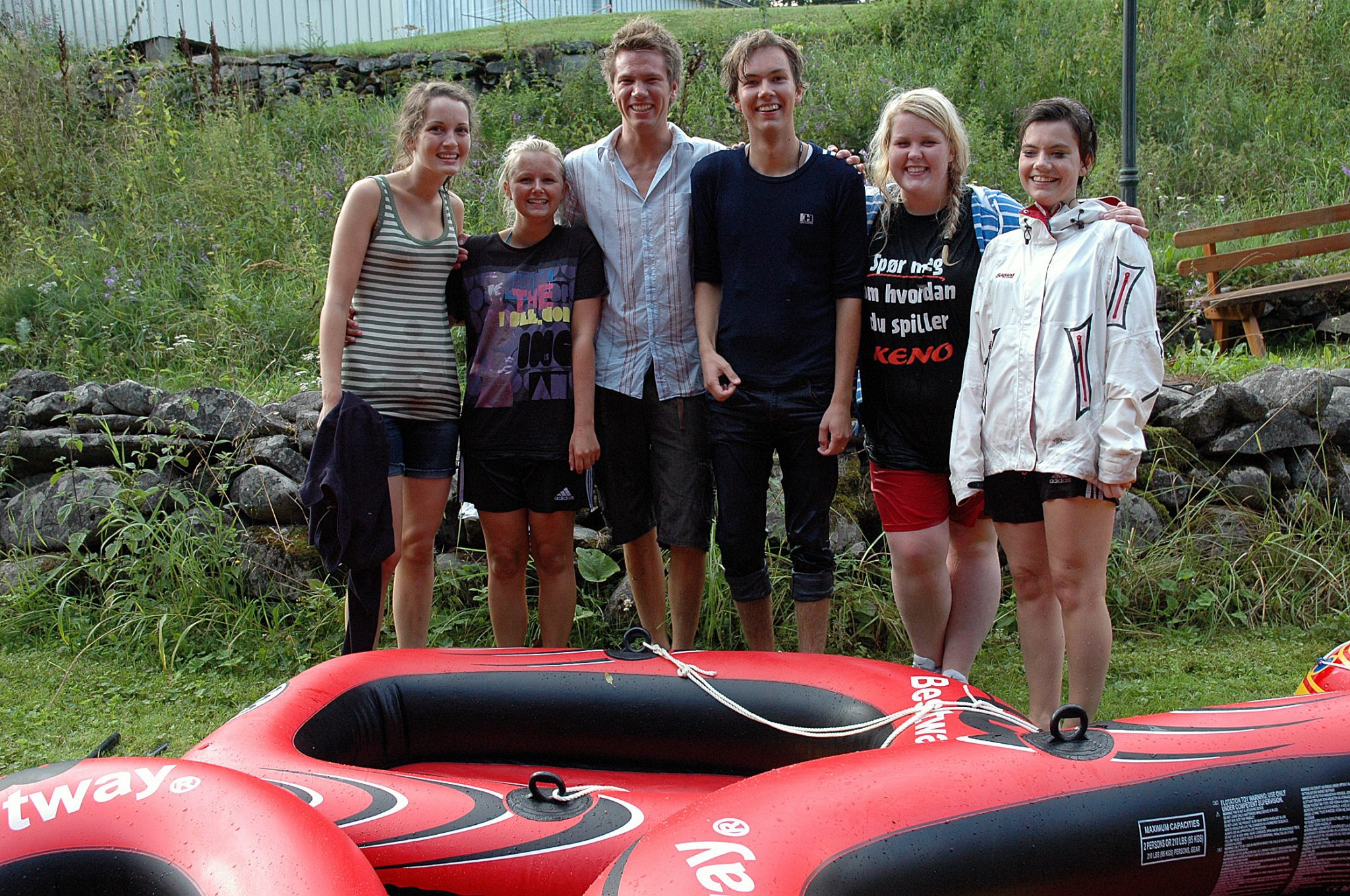 En gjennomvåt og glad gjeng etter endt ekspedisjon nedover Lenaelva. Fra venstre; Ellen Balke Hveem, Mia Hveem, Martin Skoglund, Evald Fredholm, Lisa Solveig Olsen og Karoline Dyste. (Fotos: Odd Martin Hesjadalen)
