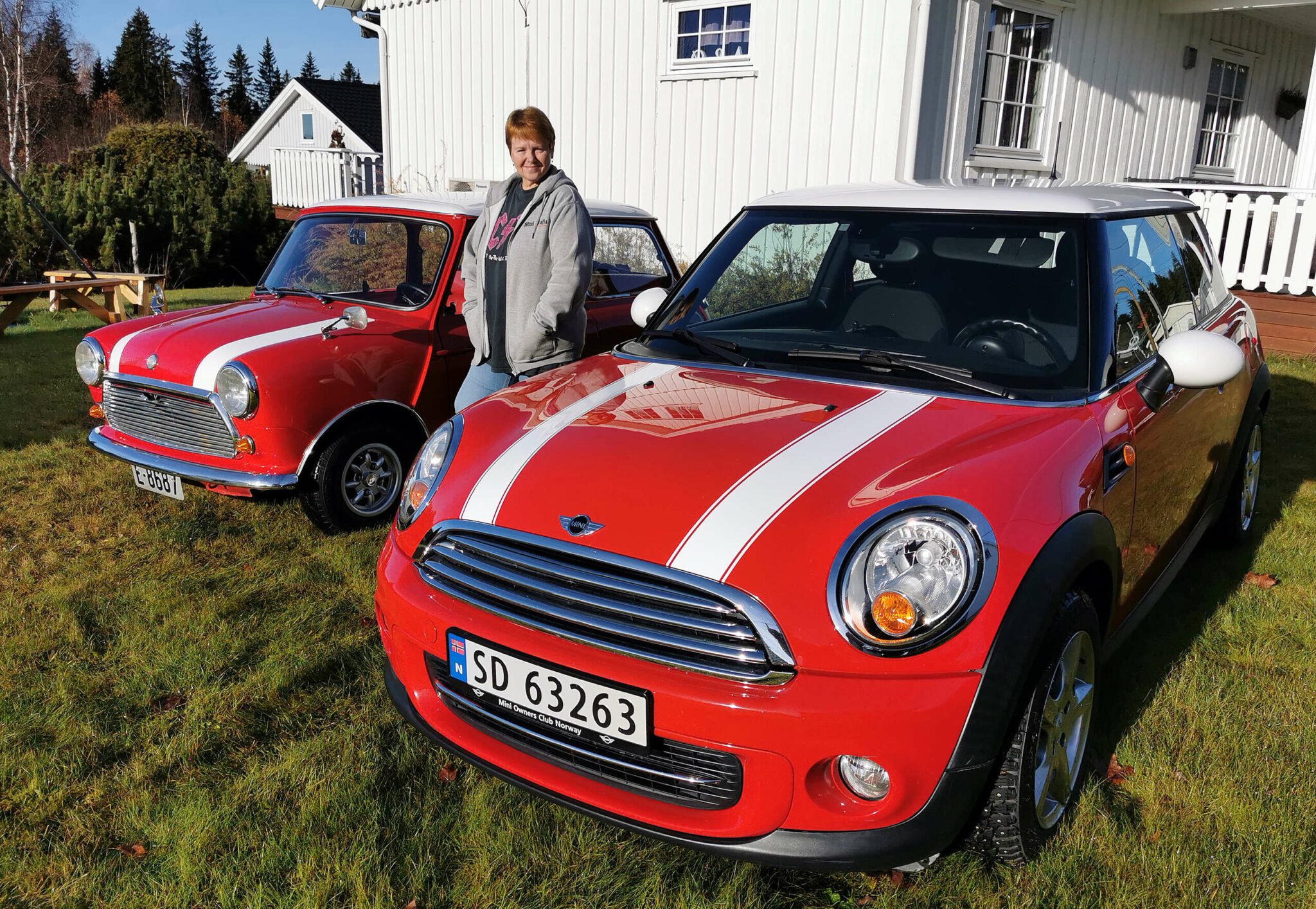 Her ser vi Mini-entusiasten Ann Vibecke Presterudgjerdet med grombilene sine, en 1969 Morris Mini 1000 og en 2011 Mini Cooper. Begge røde med hvitt tak og kledelige hvite striper. (Foto: Dag Skoglund)