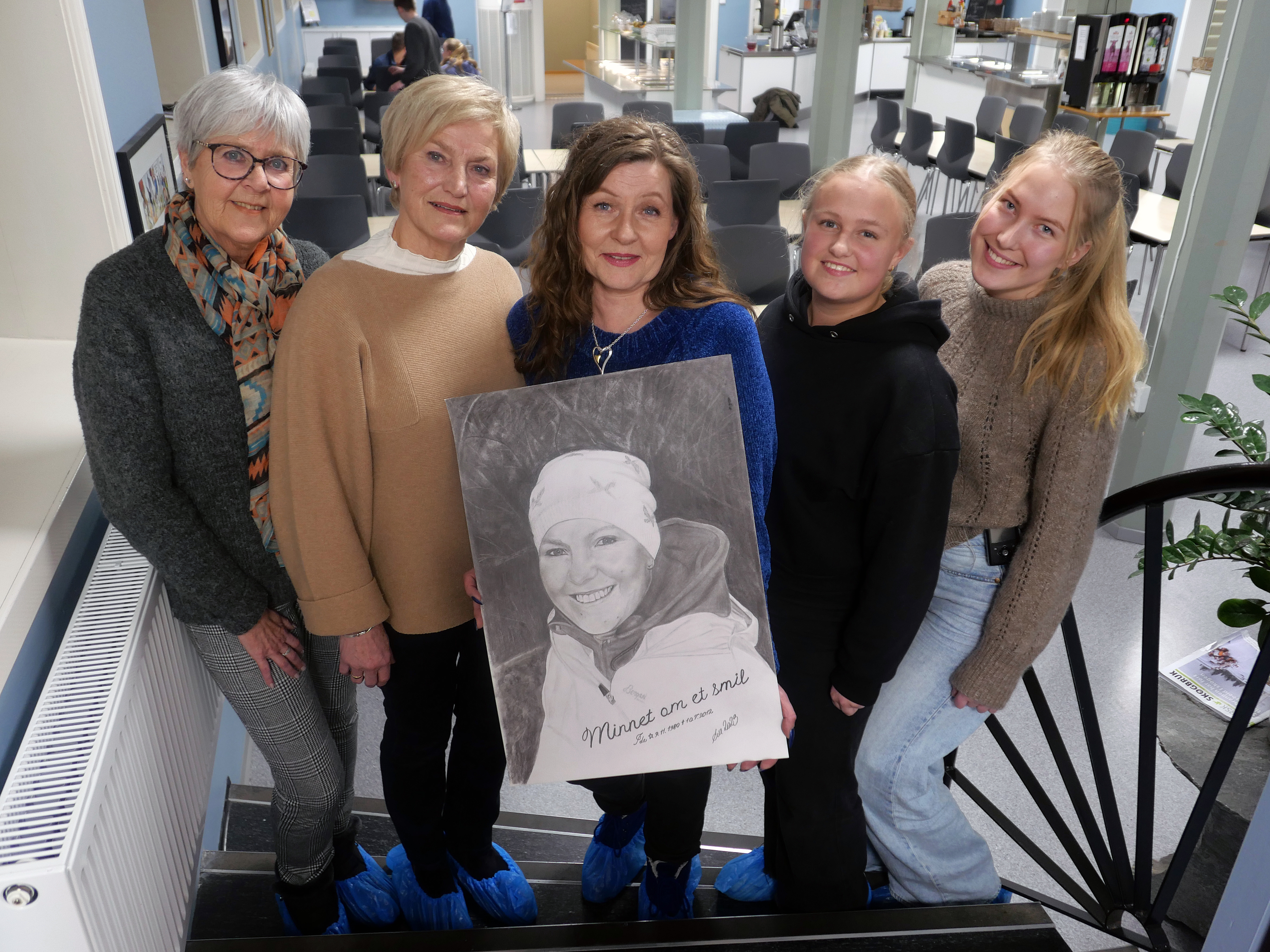Fra venstre: Idas mor Bente Amlie, Marit Kvikstad fra Lena malerklubb, kunstner Eva Ulsrud, russ Rikke Lunden og russepresident Emma Marie Rebne. (Foto: Tore Hagebakken)