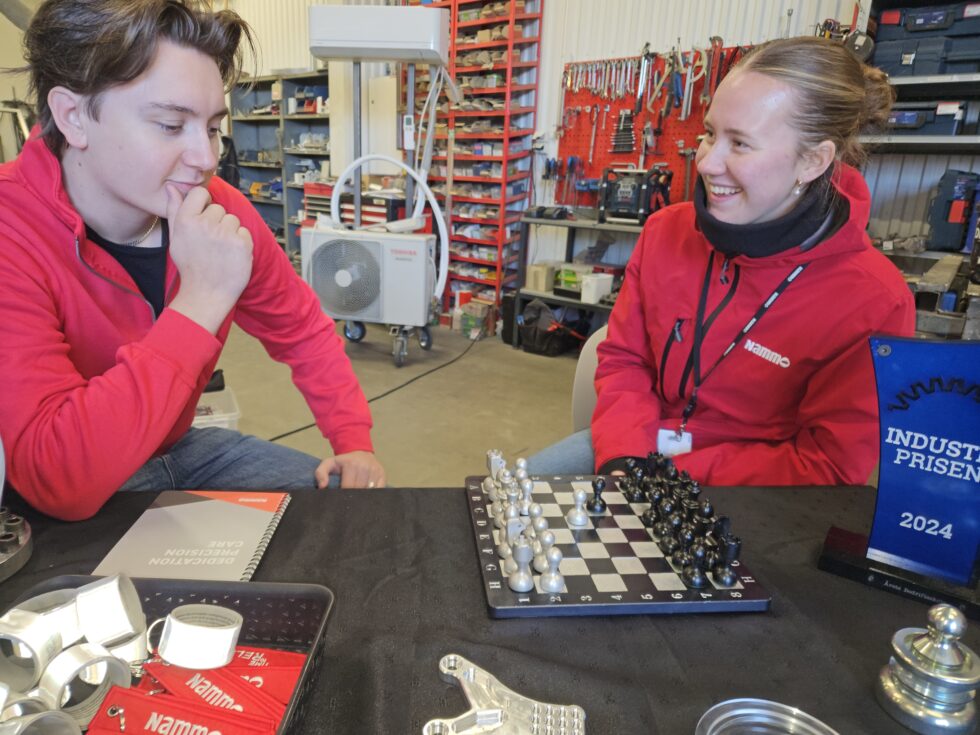 Hans Edvard Bakke og Mille Lønne Huset er begge lærlinger hos Nammo, der de dreier utviklingsdeler til bedrifter. Delene til det flotte sjakkbrettet er også dreiet på Nammo. (Foto: Unni Kristiansen)