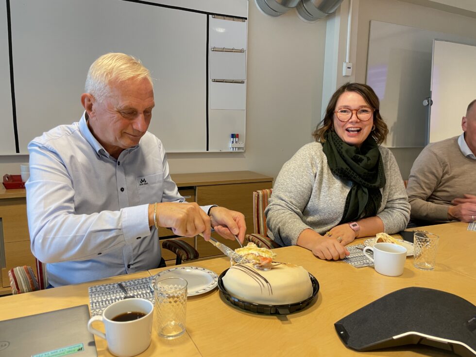 Aage Sommerstad, telefoniansvarlig i Gjøvikregionen kunne feire med kake sammen med både ordfører Tonje Bergum Jahr og de besøkende fra Telenor. (Foto: Mina B. Sveen)