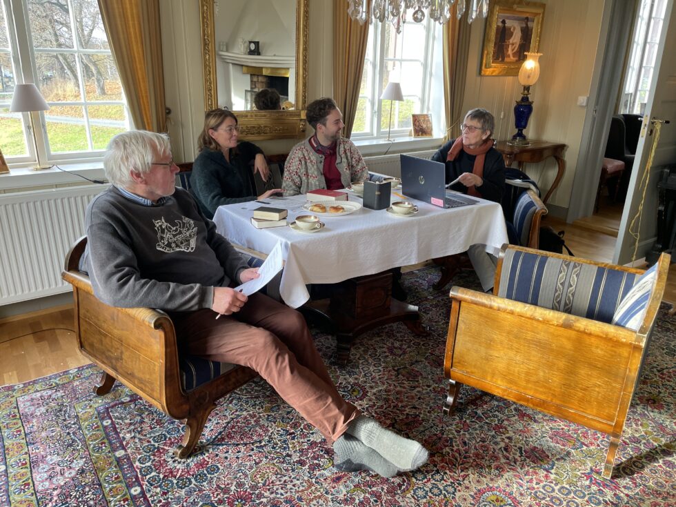 I stua på Hoff prestegard går diskusjonene livlig i forkant av jubileumsfeiringen. Olaf Nøkleby, Christina Grevbo, Evald Kvem og Jorunn Årsby finjusterer programmet. (Foto: Mina B. Sveen)