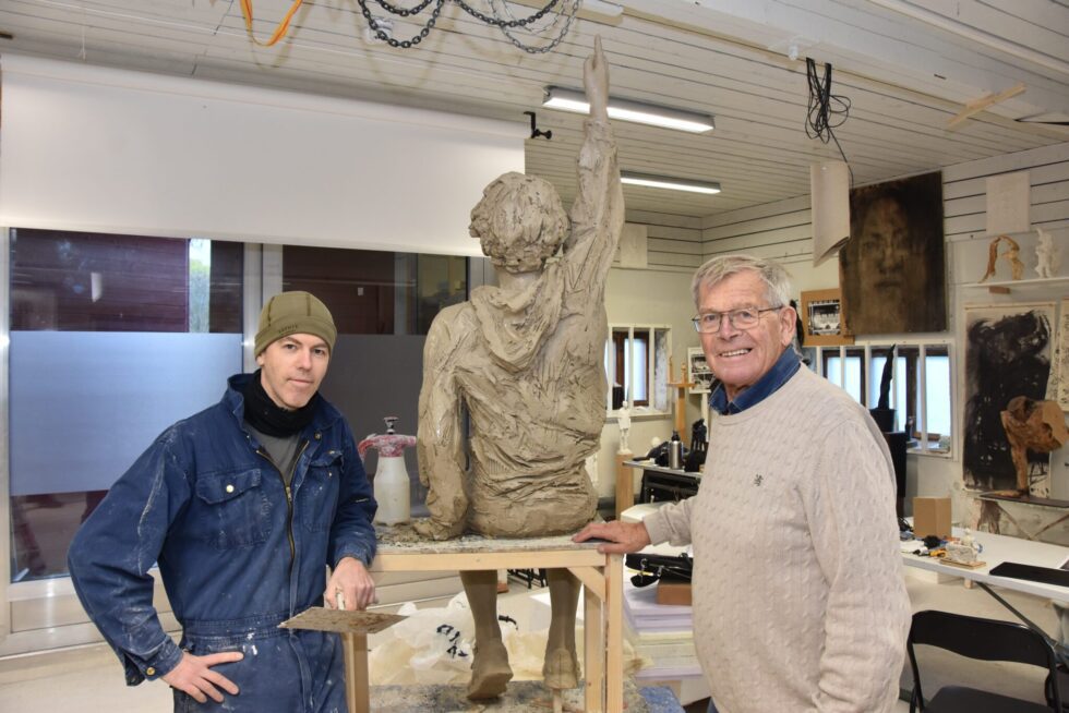 Billedhugger Henning Olav Espedal og Petter Børde, leder for prosjektgruppa for Prøysen-skulpturen, er snart i havn med prosjektet. Nå skal "Syskjenbånet" snart støpes. (Foto: Torbjørn Aurvåg)