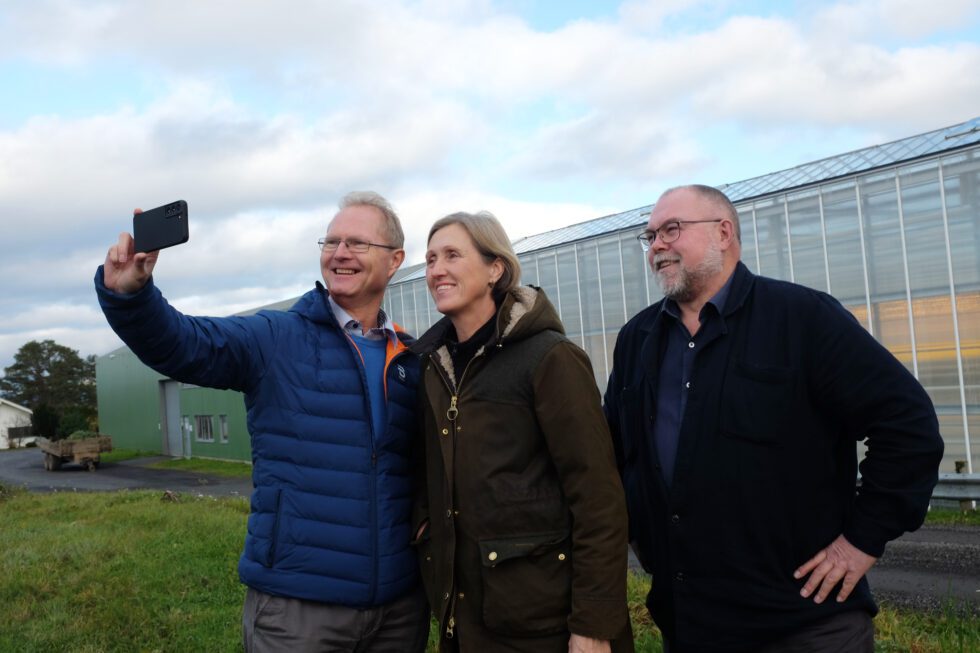 Stortingsrepresentant Tor André Johnsen måtte selvfølgelig ta selfie foran drivhuset, her sammen med Innlandets regjerende bondehøvding Camilla Rostad og stortingsrepresentant Lars Rem, Kolbu. (Foto: Knut Erik Landgraff)
