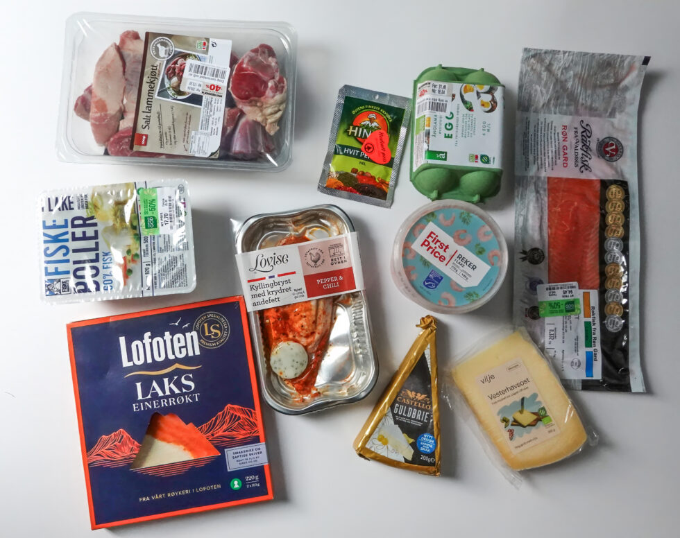 Dagens fangst! Kjøtt, fisk, ost, kylling, reker, egg og krydder havnet i handlekurven denne dagen. I artikkelen kan du se prisene og hvor mye vi sparte på å sjekke hyllene med datovarer til nedsatt pris. (Fotos: Per A. Borglund)