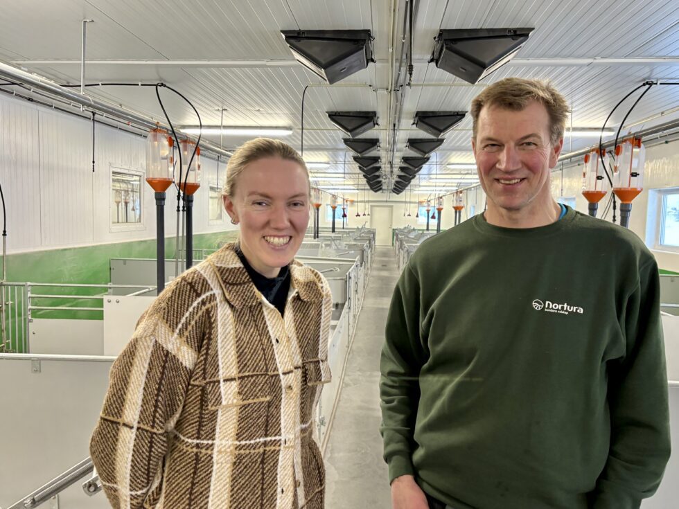 Foreløpig er det stille i fjøset, men om få dager fylles fjøset med purker, og snart nyfødte grisunger. Odelsjente Solveig Nygaard og grisebonde Svein Roar Nygaard ser fram til det blir liv i det nye grisefjøset. (Foto: Unni Kristiansen)