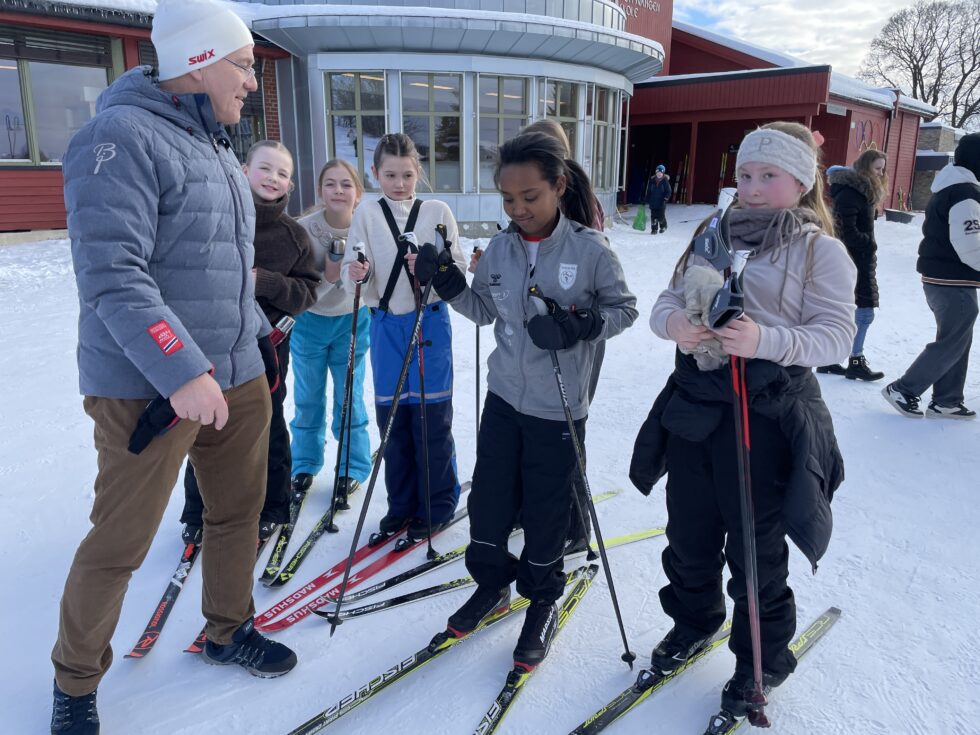 Rektor Kjell Erik Vingebakken er like begeistret for vinteridrett som elevene. Her med Ida Veronica Johansen, Martina Milenkovic, Ella Heimdal Karsrud, Yasmin Samuel Habte og Paula Grigaliunaite. (Foto: Mina B. Sveen)