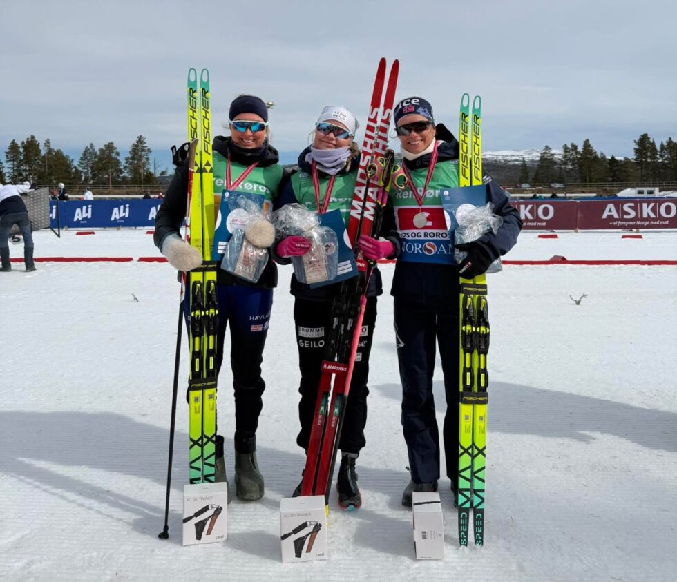 Oppland med Ragna Fodstad (til høyre) på laget tok sølv på NM-stafetten i skiskyting. De to andre på laget var Eivor Melbybråten (til venstre) og Synne Owren (Foto: Privat)
