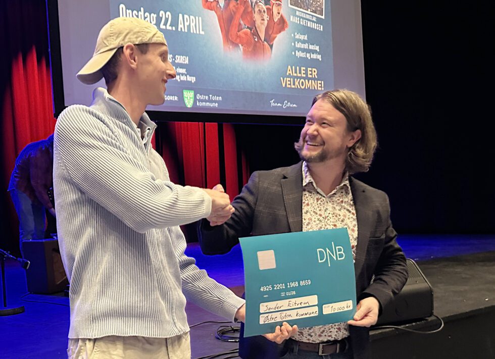 Sander Eitrem fikk ikke bare gode ord med seg på ferden videre. Kultursjef Jo-Terje Sagrusten Høyesveen kom også med en sjekk fra kommunen. (Foto: Geir Farås)