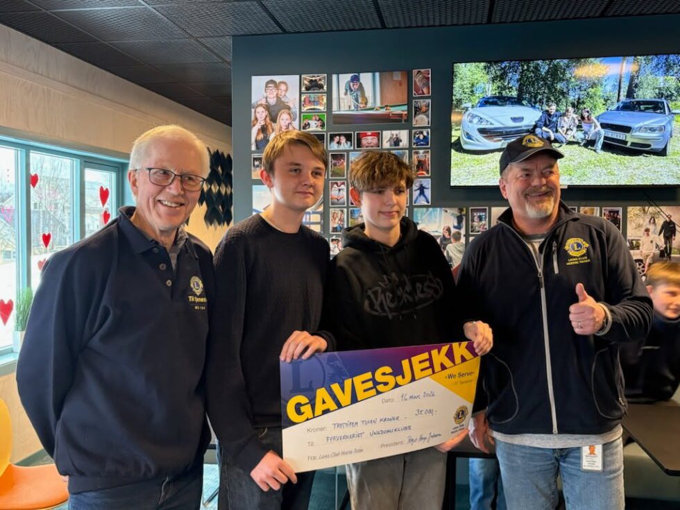 Tor Edvard Løken (til venstre) og Roger Hugo Johnsen (til høyre) i Lions Club Vestre Toten kom med en stor overraskelse til Leander Linnerud Hermanrud og Marius Solberg ved Fyrverkeriet ungdomshus. (Foto: Jan Erik Sandmo)